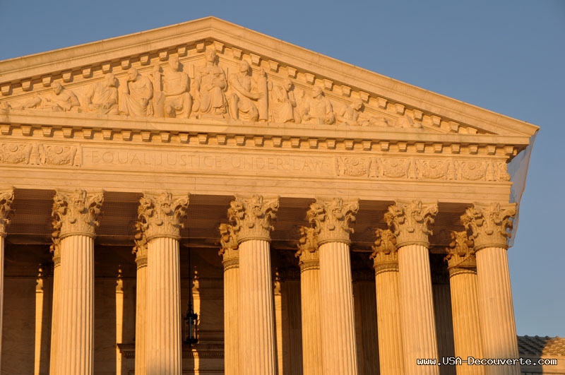 Construite entre 1932 et 1935 par le célèbre architecte Cass Gilbert (Woolworth Building à Manhattan) dans un style de type corinthien s’accordant avec les bâtiments environnants. Plus haute autorité judiciaire des Etats-Unis, la cour suprême, composée de huit juges et d’un Chief Justice a pour rôle de vérifier la conformité à la constitution des actes du Président et du Congrès.